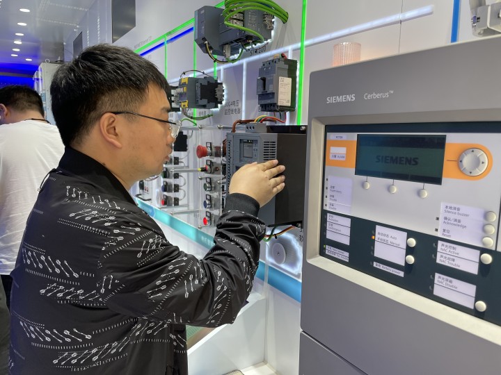 輛集裝箱大卡車別出心裁地裝飾成移動(dòng)的“會(huì)展中心”,印有西門子標(biāo)志的旗幟迎風(fēng)飄揚(yáng),車身“共創(chuàng)智能基礎(chǔ)設(shè)施新生態(tài)”幾個(gè)大字格外醒目。